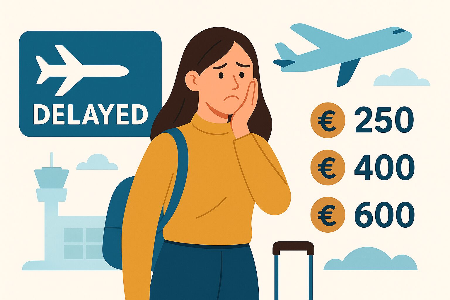 最終到着が3時間以上の遅延で、EU出発またはEU航空会社運航かつ航空会社責任なら対象です。例:パリ発東京便が4時間遅れ → €600。(制度解説:欧州委員会 Passenger Rights)