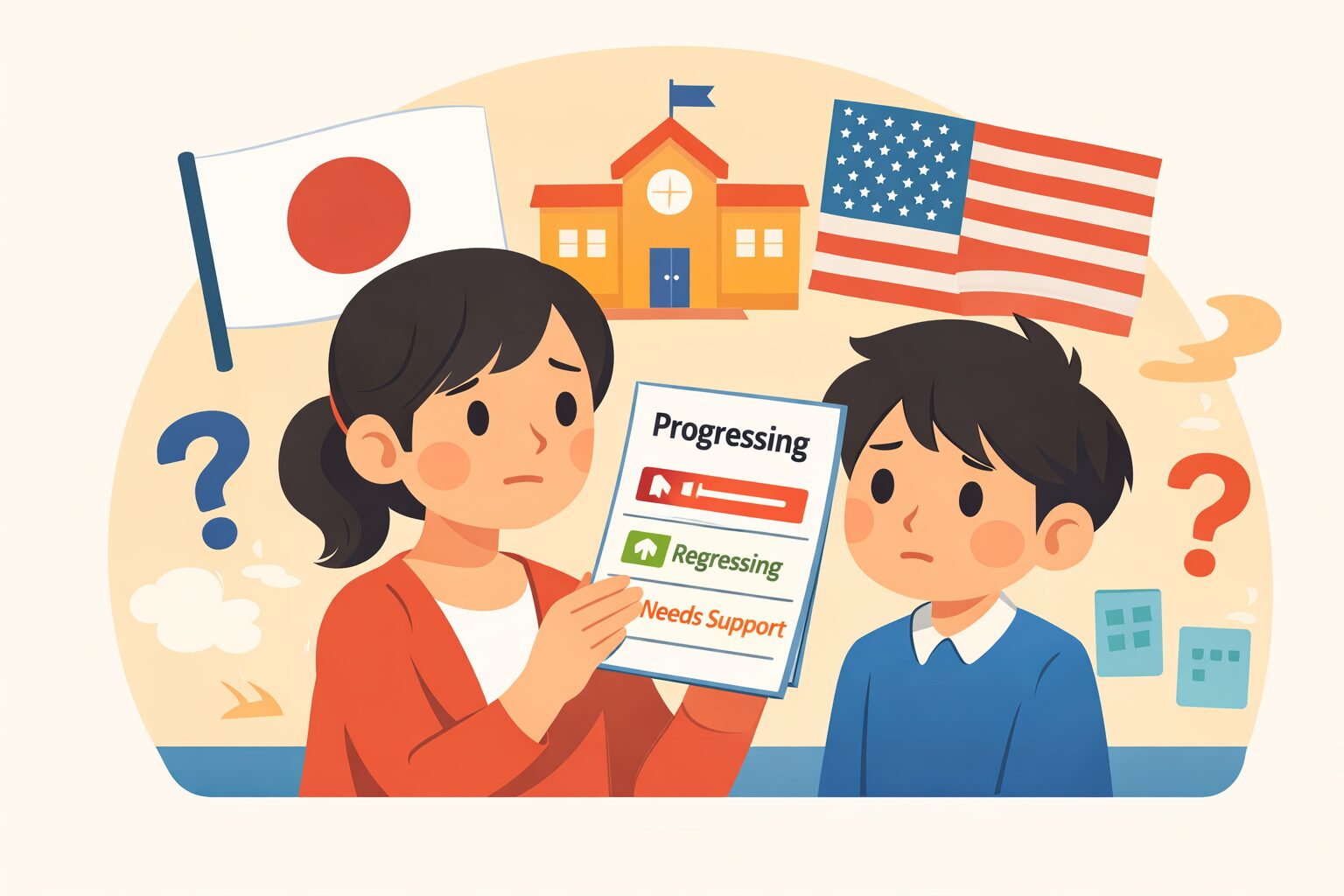 これらは学力不足というより、言語の壁による見え方の問題です。特に低学年では、この影響が成績表に反映されやすくなります。